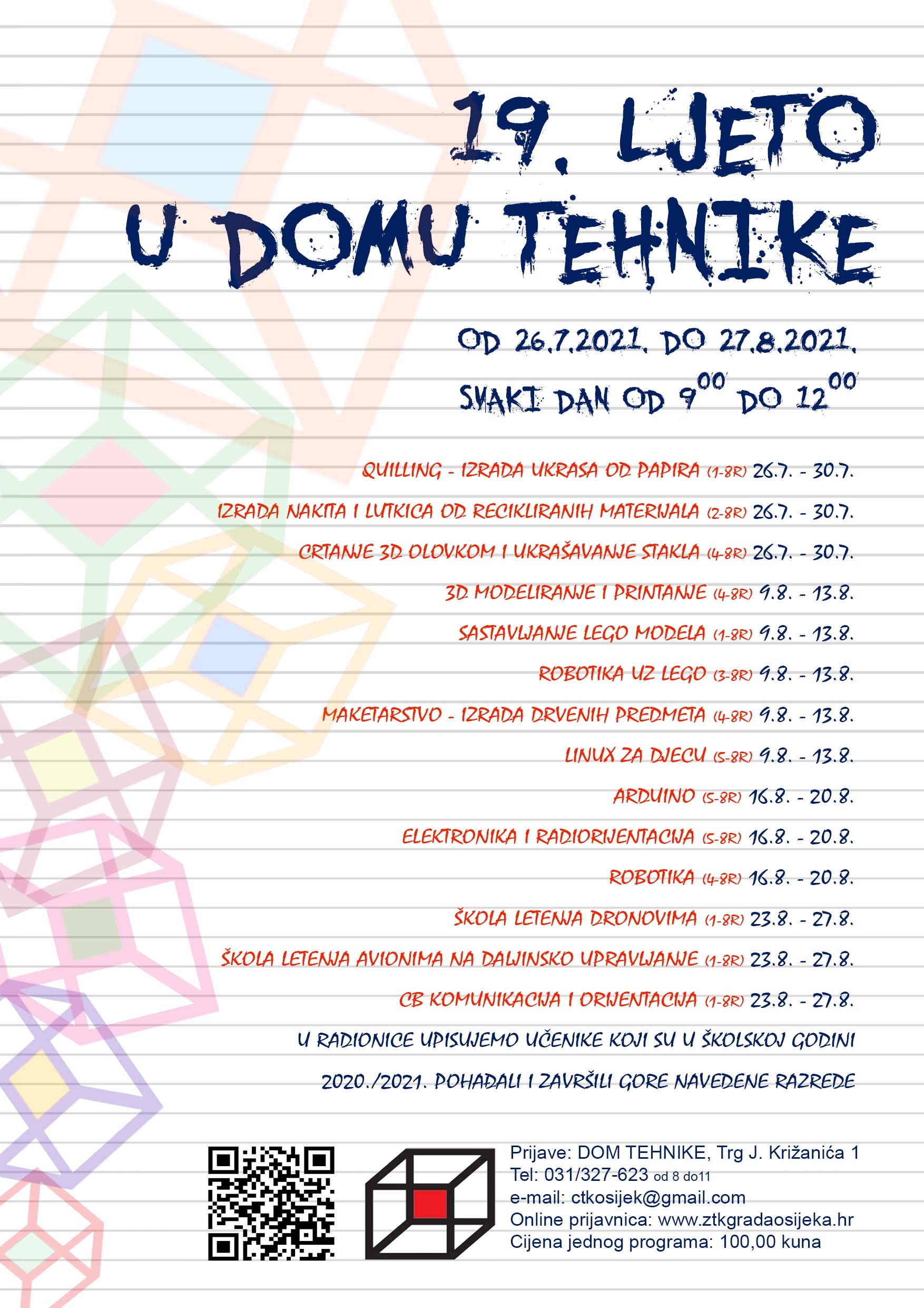 U vremenu od 26. srpnja 2021. do 27. kolovoza 2021. pozivaju se učenici osnovnih škola Grada Osijeka da se uključe u radionice tehničkih aktivnosti koje će biti organizirane za vrijeme ljetnih školskih praznika, u Domu tehnike u osječkoj Tvrđi, u okviru projekta “19. Ljeto u Domu tehnike”.